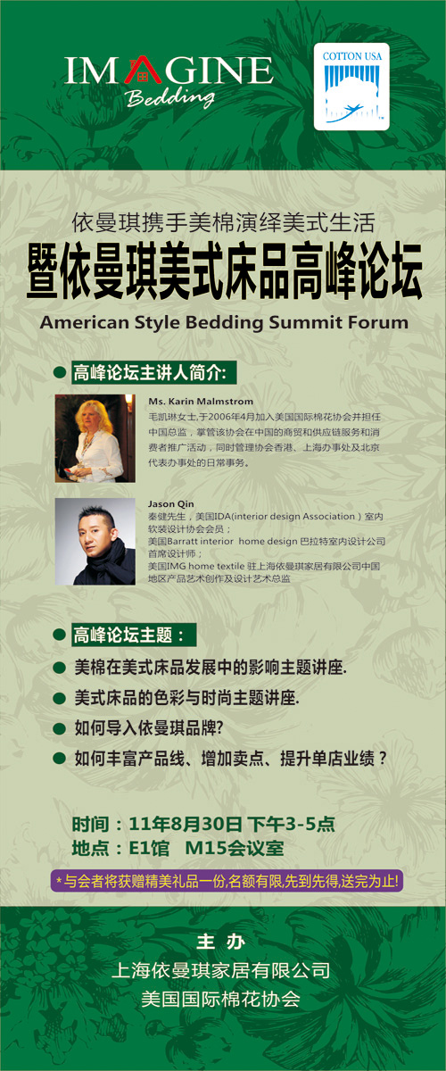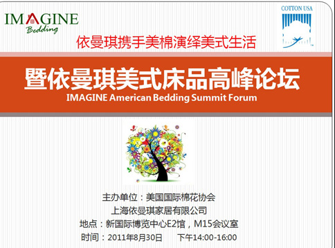 在8月29日至31日召开的上海家纺展上,倡导美式家居整体软装的依曼琪家纺亮相此次展会,除了以特装展位亮相之外,依曼琪还将在8月30日下午14点,与国际行业权威机构——美国棉花协会共同主办一场“美式家纺发展高峰论坛”。届时,来美国棉花协会美国知名设计师及行业顶尖人士将对美式床品发展趋势及床品流行色等企业关心问题做专题讲解。